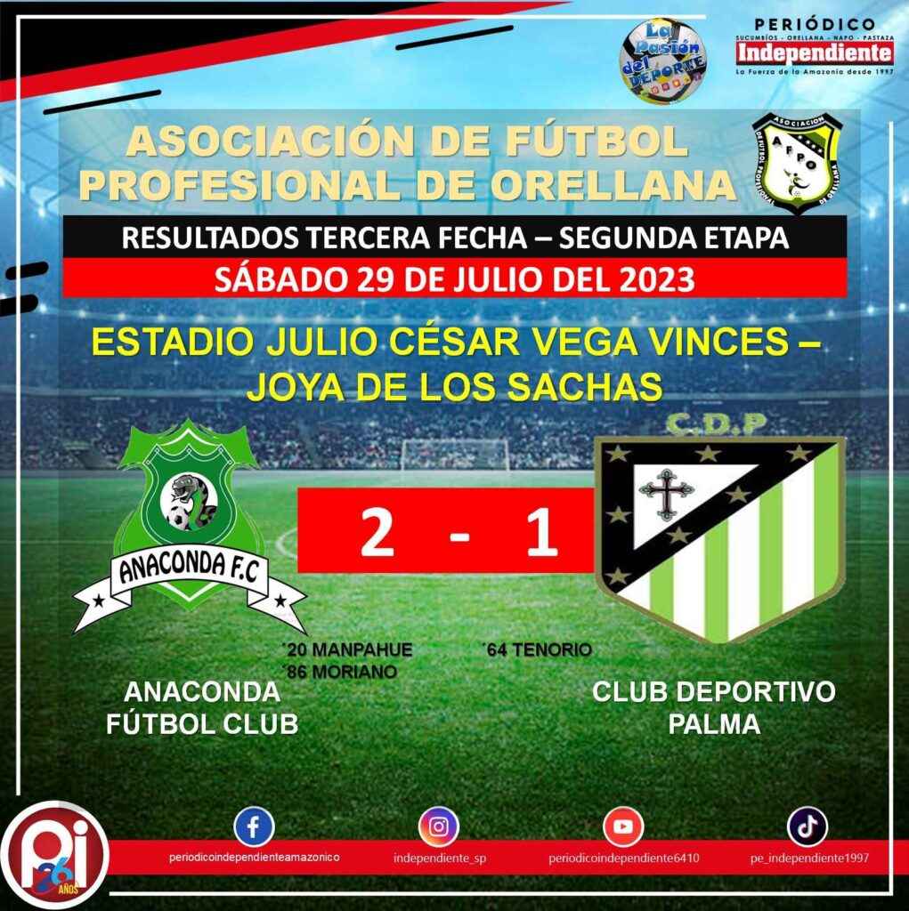 En el cierre de la jornada en el Estadio Julio César Vega Vinces de la Joya de los Sachas, el gigante amazónico Anaconda Fútbol Club recibía a Deportivo Palma, un encuentro que fue muy atractivo desde inicio hasta el final, con muchas emociones, a los 20 minutos tras un error del cancerbero José Zapata del Palma aprovecho Manpahue para poner la primera para Anaconda, con ello se fueron al descanso 1 – 0. Para la parte complementaria Deportivo Palma saltaría con intenciones de cambiar la historia del partido y a los 64 minutos tras un tiro libre cobrado por Martínez apareció dentro del área Deyby Tenorio para anotar el empate 1 – 1, y cuando parecía que el compromiso iba a terminar empatado a los 86 minutos tras un centro por derecha de Hernández hacia el área Bryan Moriano la empujo al fondo de la redes para marcar el 2 – 1 con el cual el gigante amazónico ganaría el encuentro.