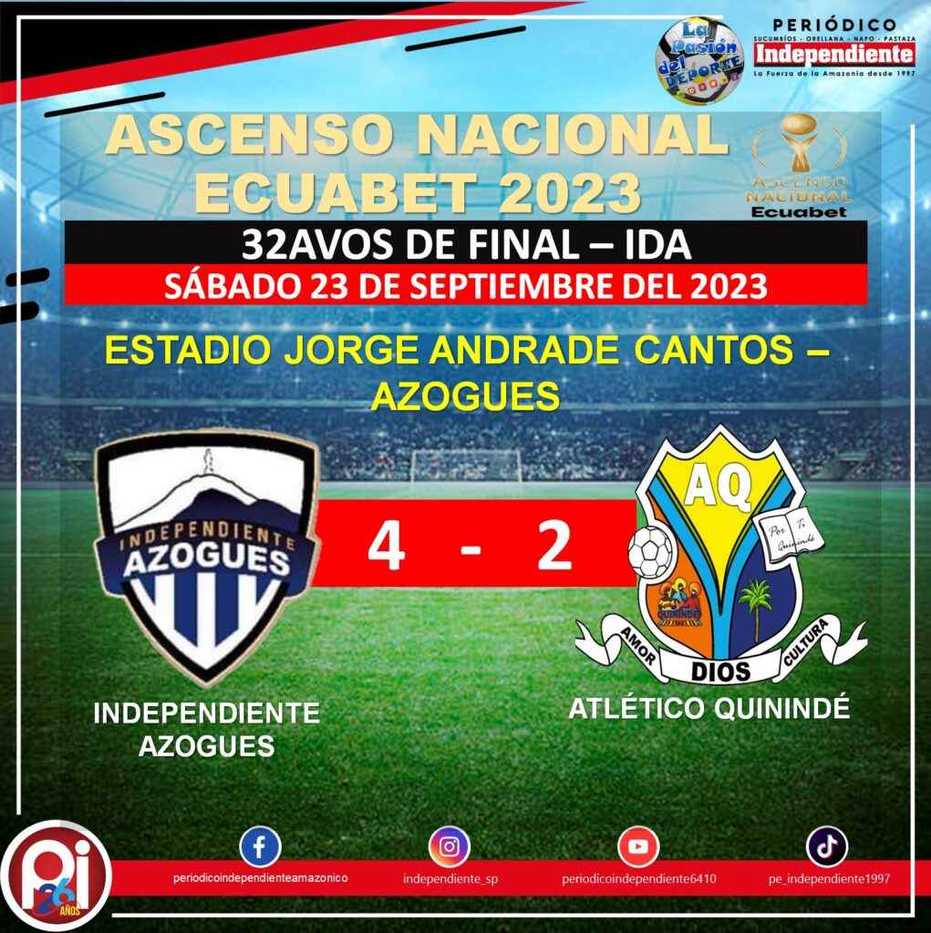El Independiente Azogues hizo respetar su casa y consiguió una importante victoria 4 – 2 sobre el Atlético Quinindé encuentro jugado en el Estadio Jorge Andrade Cantos, a los 27 minutos David Peralta ubicaba el 1 – 0 para los locales, cerca del final del primer tiempo a los 44 minutos José Navarreño ubicaba el empate para irse al descanso, en la parte complementaria a los 54 minutos Meza aumentaba el marcador para los locales 2 – 1, y un nuevo gol de Peralta a los 64 minutos ponía el 3 – 1, a los 69 minutos José Lastra sentenciaba el 4 – 1, a los 75 minutos Navarreño puso el 4 – 2 final y con ello la revancha se jugara en el Folke Anderson.