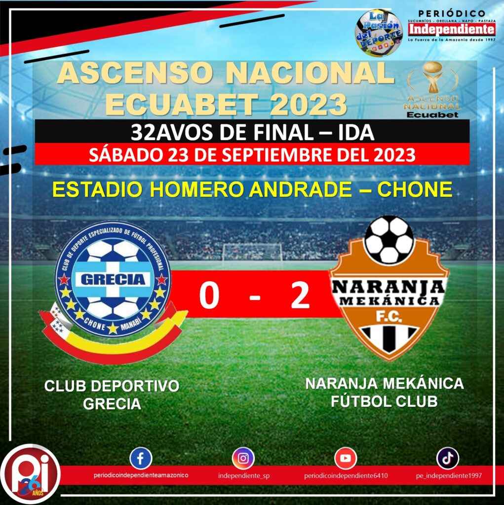 El compromiso más apasionante de esta jornada se jugaba en el Estadio Homero Andrade en Chone donde el Club Deportivo Grecia recibía al gran Naranja Mekánica Fútbol Club, esta primera parte iba a ser victoria guayaquileña donde a los 9 minutos Mario Barrionuevo ubicaba el 0 – 1 y a los 85 minutos Eduardo Esterilla cerraba la victoria de la Naranja 0 – 2, el compromiso de revancha se jugara en el puerto principal, encuentro que promete muchas emociones.