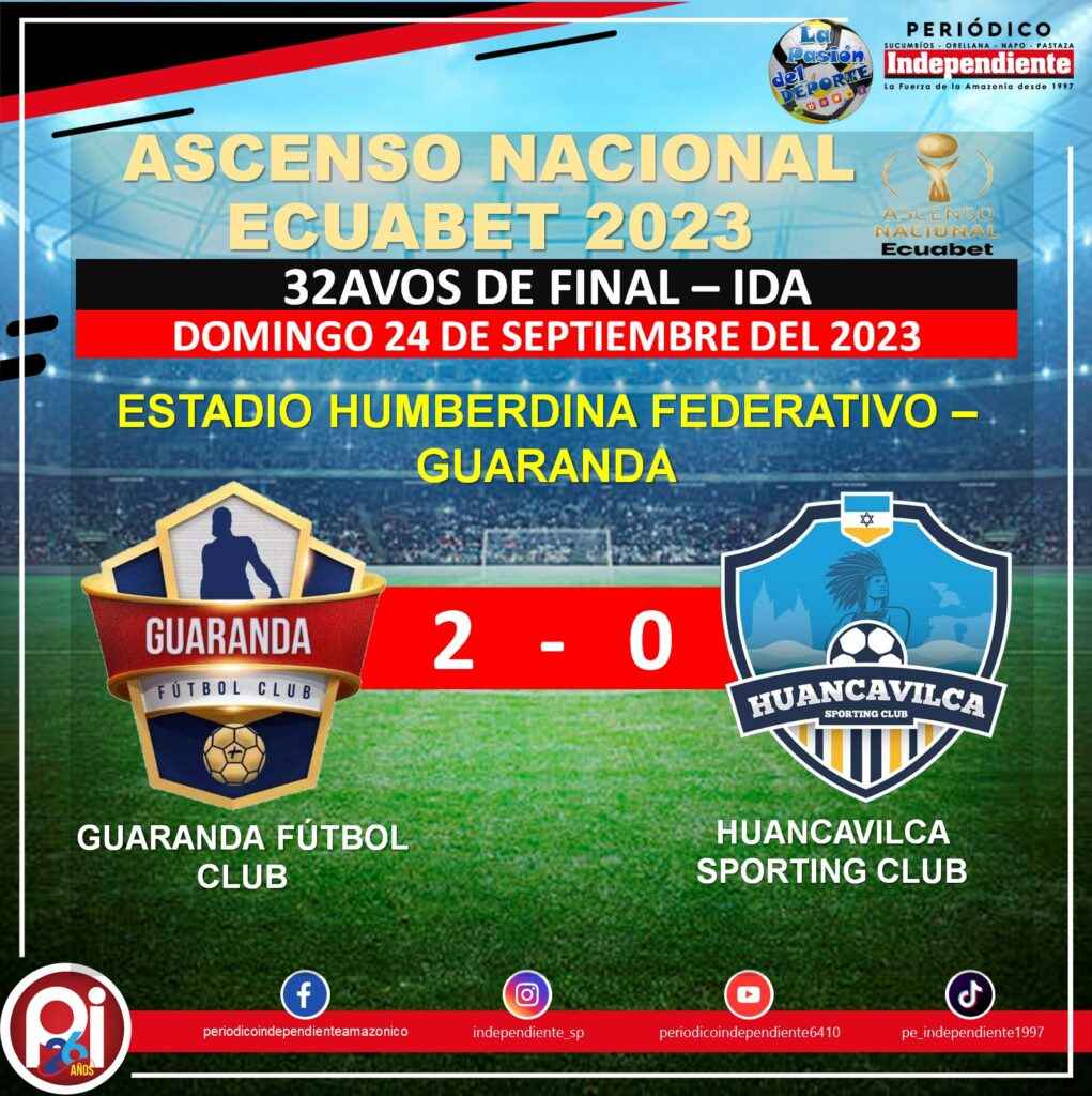 Guaranda Fútbol Club derroto de local 2 – 0 a Huancavilca Sporting Club, a los 34 minutos Juan Aristega y a los 39 minutos Steven Montaño le dieron la victoria al cuadro bolivarense, que llevaría ventaja para la revancha en Santa Elena.