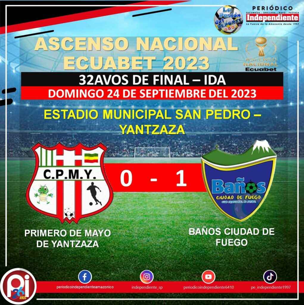El Primero de Mayo de Yantzaza no pudo de local y cayó derrotado en manos de Baños Ciudad de Fuego, a los 45 minutos de penal Víctor Álvarez puso el solitario gol con el que gano la visita y todo se definirá en Tungurahua donde el cuadro Zamorano deberá ir a buscar remontar ese marcador.