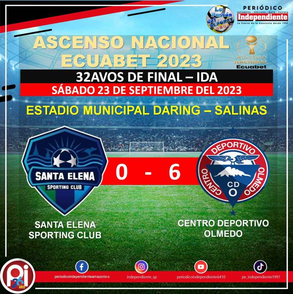 En Salina se registró la única goleada de esta primera parte de los 32avos de final, donde Santa Elena Sporting Club no pudo ante un difícil Centro Deportivo Olmedo, a los 39 minutos el argentino Jorge Detona ponía a ganar al ciclón 0 – 1 con el cual se iban al descanso, en la parte complementaria a los 53 minutos Christian Sánchez aumentaba la cuenta 0 – 2 y un minuto más tarde a los 54 nuevamente Detona marcaba en su cuenta personal ubicando el 0 – 3, a los 64 minutos Jonathan Cevallos ubicaba el 0 – 4, el argentino Lucas Pugh a los 72 minutos ponía el 0 – 5 y para cerrar la goleada Jorge Luis Cuesta a los 83 minutos sentenciaba un 0 – 6 para dejar la llave casi liquidada en este compromiso.