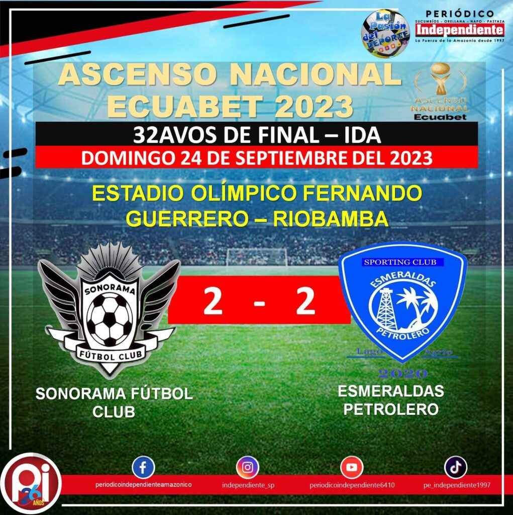 Sonorama Fútbol Club y Esmeraldas Petrolero dividieron honores en el Olímpico Fernando Guerrero de Riobamba, el brasileño Ricardo da Silva abría el marcador para los esmeraldeños a los 21 minutos, a los 34 minutos David Ruano empataba para los locales de esa manera con el 1 – 1 se iban al descanso, en la parte complementaria Jonathan Caicedo a los 69 minutos nuevamente ponía en ventaja a la visita, y cuando parecía que se llevaba la victoria Esmeraldas Petrolero apareció Jorge López a los 90+5 minutos para poner el empate final 2 – 2. La llave queda abierta para la revancha en Esmeraldas.