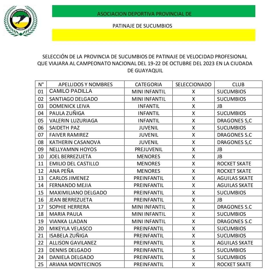 La Asociación de patinaje de Sucumbíos realizo la selección de los deportistas que viajaran hasta la ciudad de Guayaquil para la competencia en el Campeonato Nacional de Patín Profesional, un total de 25 deportistas fueron los seleccionados.