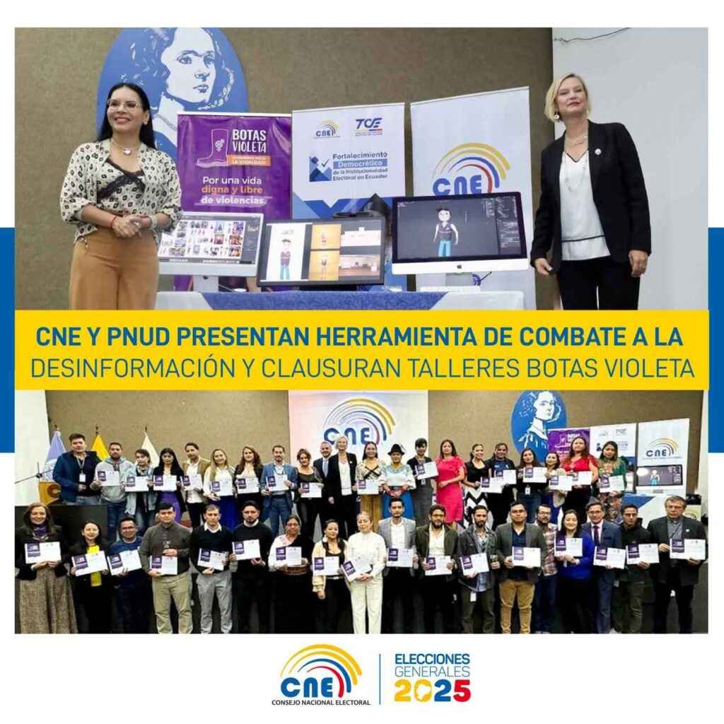 El pasado 10 de septiembre, el Consejo Nacional Electoral (CNE) junto al Programa de las Naciones Unidas para el Desarrollo en Ecuador (PNUD) presentaron una herramienta de combate a la desinformación y clausuraron los talleres Botas Violeta, destinados a la formación continua de los funcionarios electorales en temas de igualdad de género.
