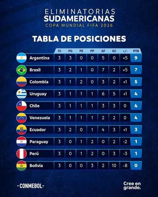 La tabla de posiciones se encuentra liderando ahora Argentina con puntaje perfecto 9 puntos +5 GD, segundo lugar Brasil con 7 puntos +5 GD, por su lado Ecuador se ubica en el séptimo lugar con 3 puntos +1 GD.