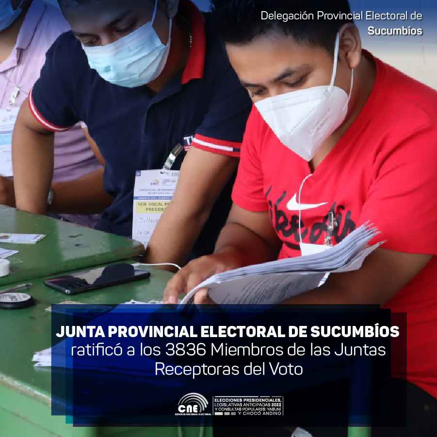 La Junta Provincial Electoral de Sucumbíos, liderado por Cecibel Paz, aprobó ratificar a los ciudadanos que fueron designados como miembros de las Juntas Receptoras del Voto (MJRV), seleccionados en la provincia de Sucumbíos durante las Elecciones Seccionales de 2023.