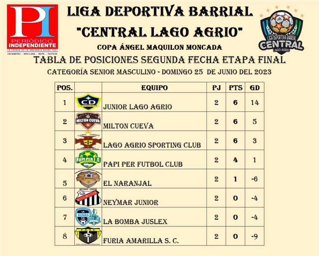 La categoría senior masculino cumplió la segunda fecha del hexagonal final en la cancha del Barrio El Cañaveral, donde el líder Junior Lago Agrio gano, gusto y goleo a Furia Amarilla por 9 – 1, Milton Cueva y Lago Agrio Sporting Club también sumaron de a tres.