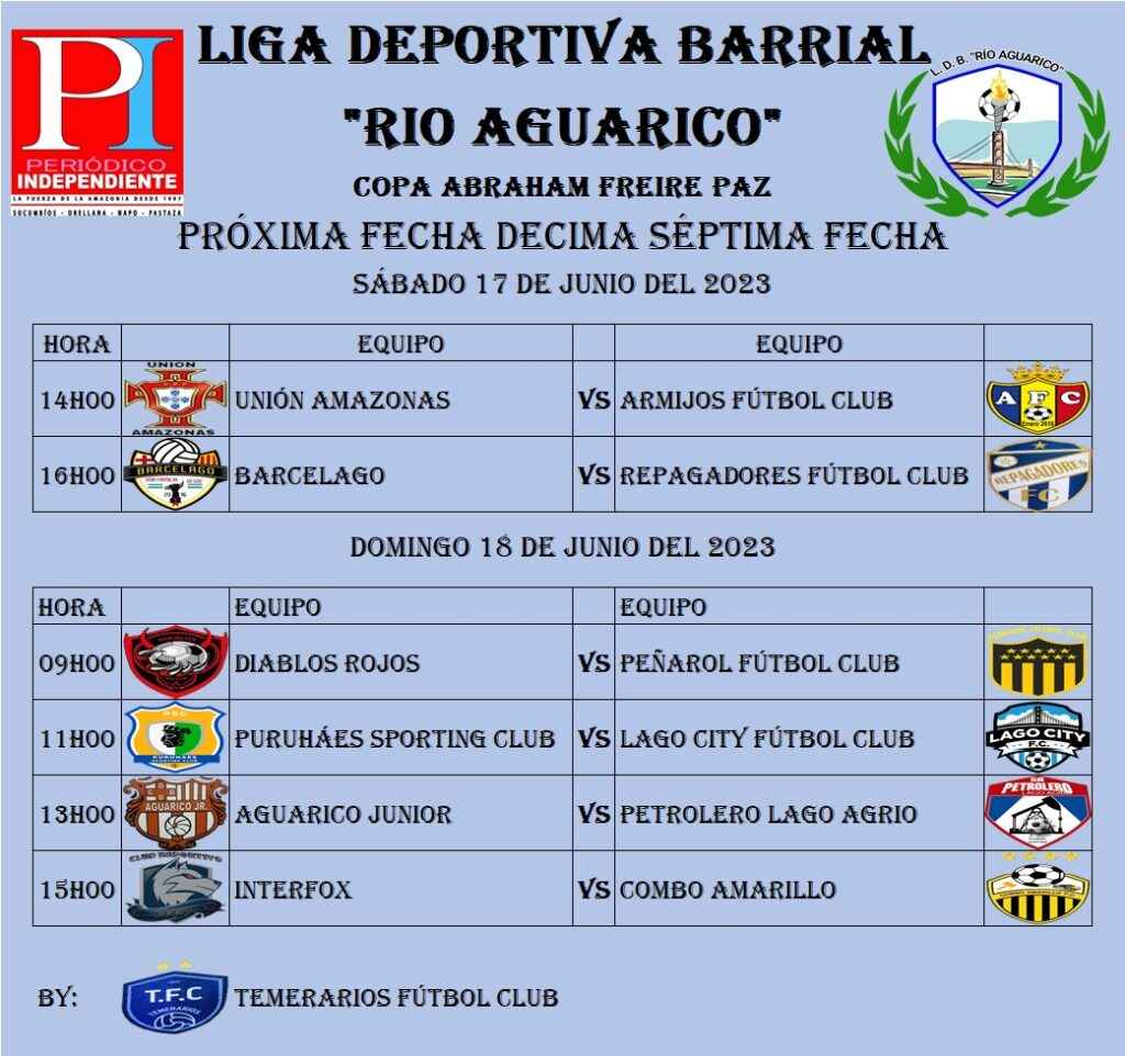 Entre sábado 17 y domingo 18 de junio se jugará la décima séptima fecha, donde Barcelago buscará frenar al líder Repagadores y Petrolero buscara mantener la distancia al enfrentar al gran Aguarico Junior.