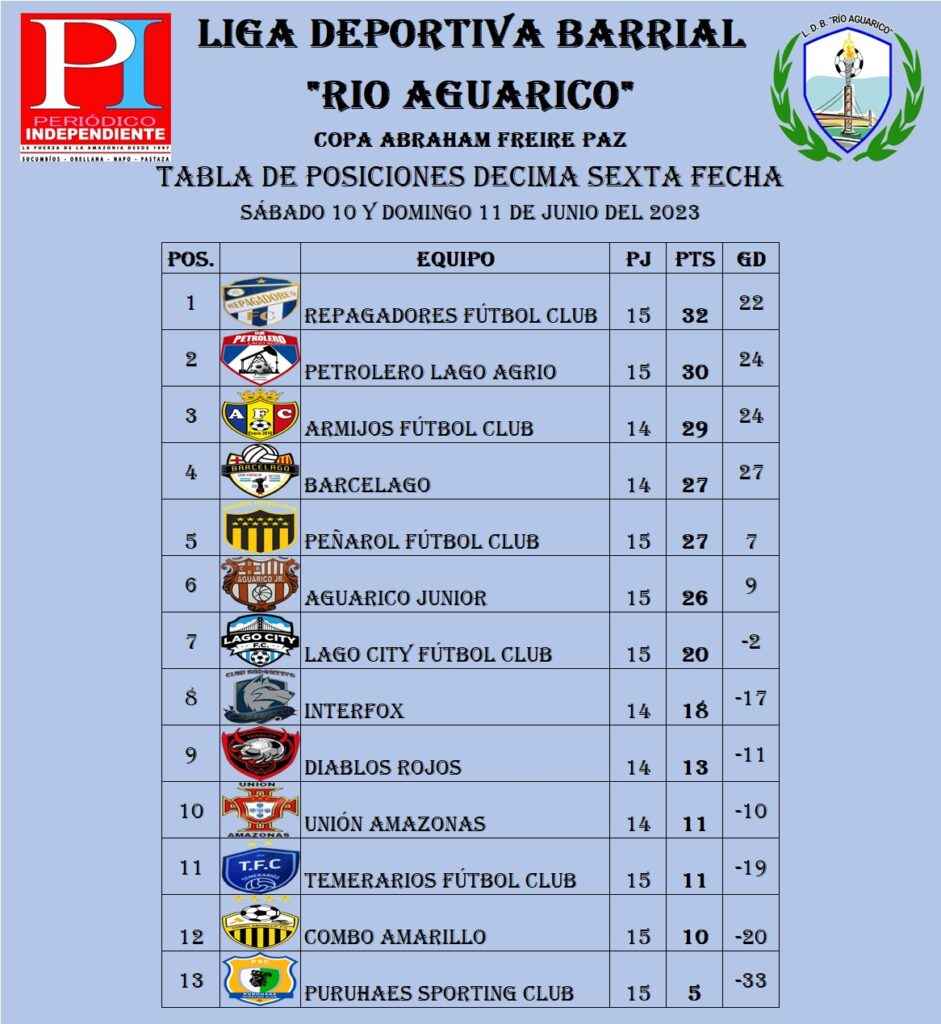 El pasado fin de semana, sábado 10 y domingo 11 de junio, se jugo la décima sexta fecha del fútbol senior masculino donde el líder Repagadores Fútbol Club cayó en manos de Petrolero Lago Agrio 3 – 4, a pesar de la derrota se mantiene líder, por su lado Petrolero acorta distancia a dos puntos.