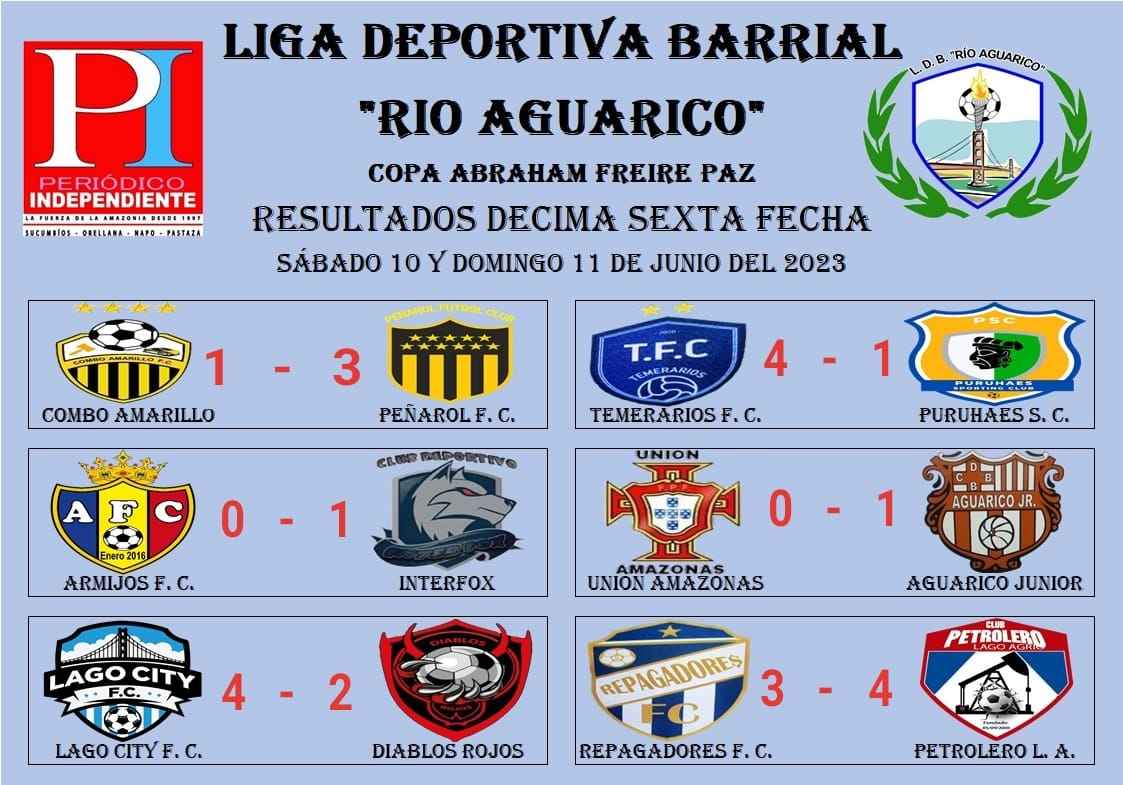 El pasado fin de semana, sábado 10 y domingo 11 de junio, se jugo la décima sexta fecha del fútbol senior masculino donde el líder Repagadores Fútbol Club cayó en manos de Petrolero Lago Agrio 3 – 4, a pesar de la derrota se mantiene líder, por su lado Petrolero acorta distancia a dos puntos.