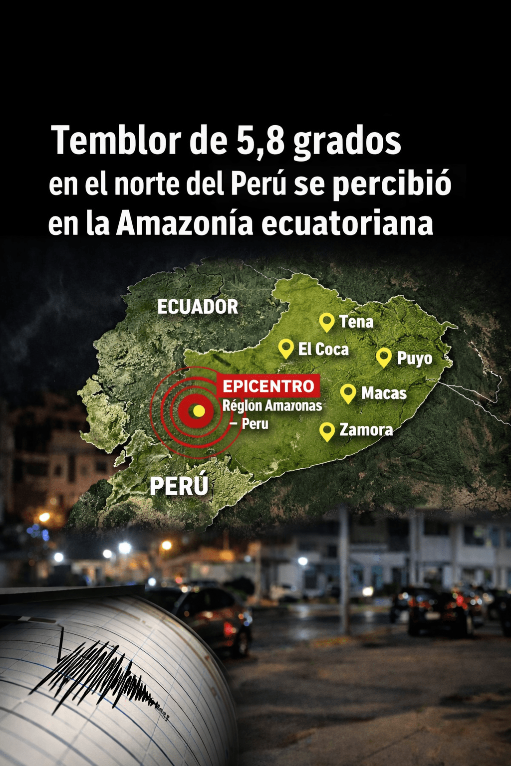 Un sismo de magnitud 5,8 se registró la madrugada de este jueves 8 de enero en la región Amazonas, al norte del Perú, informó el Instituto Geofísico del Perú (IGP). El movimiento telúrico fue percibido en varias ciudades del Ecuador, especialmente en la región amazónica y zonas cercanas a la frontera.