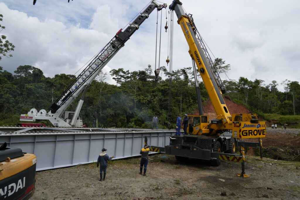 Para el montaje de la estructura metálica se utilizó dos grúas mecánicas tipo  Link-Belt, una vez colocada en sus bases, continúa la fundición de la estructura de rodamiento de hormigón y pasamanos de seguridad, este puente tiene una inversión de $ 284.336,72 dólares americanos y se encuentra en un 95% de avance.