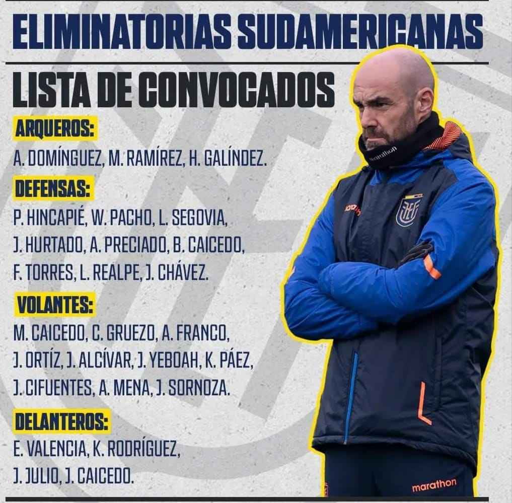 Sánchez Bas convoco a: Arqueros: Alexander Domínguez (Liga de Quito), Hernán Galíndez (Aucas), Moisés Ramírez (Independiente del Valle).