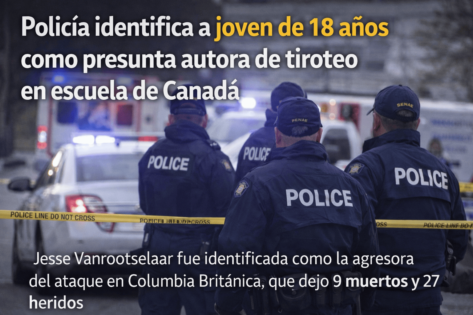 Tumbler Ridge, Canadá | 11 de febrero de 2026. La Policía Montada de Canadá (RCMP) identificó este miércoles a Jesse Vanrootselaar, de 18 años, como la presunta autora del tiroteo ocurrido en una escuela secundaria de Tumbler Ridge, en la provincia de Columbia Británica, que dejó nueve personas fallecidas y 27 heridas.