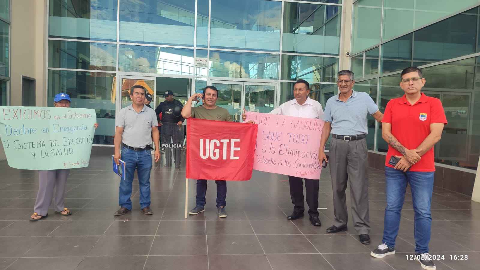 En las afueras del C. A. C. donde están ubicadas las oficinas de Gobernación de Sucumbíos, personal de la UNE se dieron cita para presentar su protesta ante la demanda de inconstitucionalidad del reglamento de la LOEI.