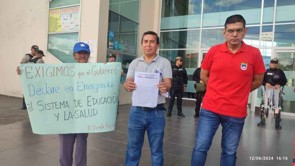 A nivel nacional estamos como Frente Popular presentando nuestros plantones en las Gobernaciones, haciendo sentir nuestro malestar ante esta situación que vive el país, nuestro rechazo a toda la línea neoliberal, a toda la línea entreguista de este gobierno viene realizando con el gobierno norteamericano con el Fondo Monetario Internacional, no vemos resuelto el tema del empleo con estabilidad laboral, con salarios dignos, no vemos resuelto ese problema, todo lo contrario vemos muchas personas que optan por migrar al exterior por buscar mejoras para sus vidas y familias, enfatizo Ignacio Condoy Del Frente Popular Democrático Sucumbíos.